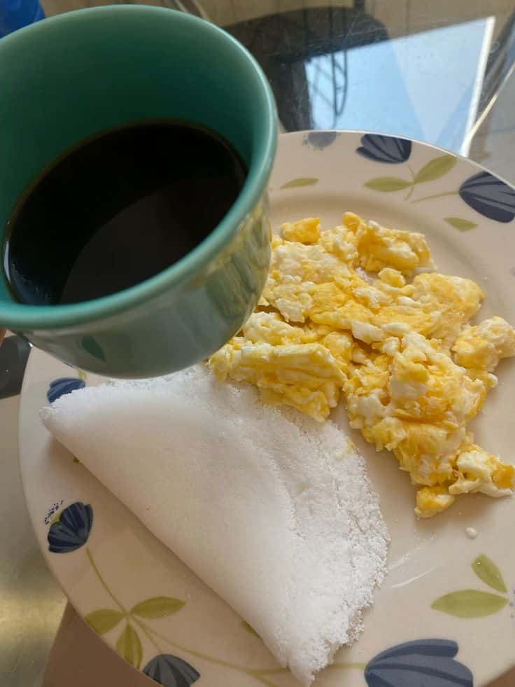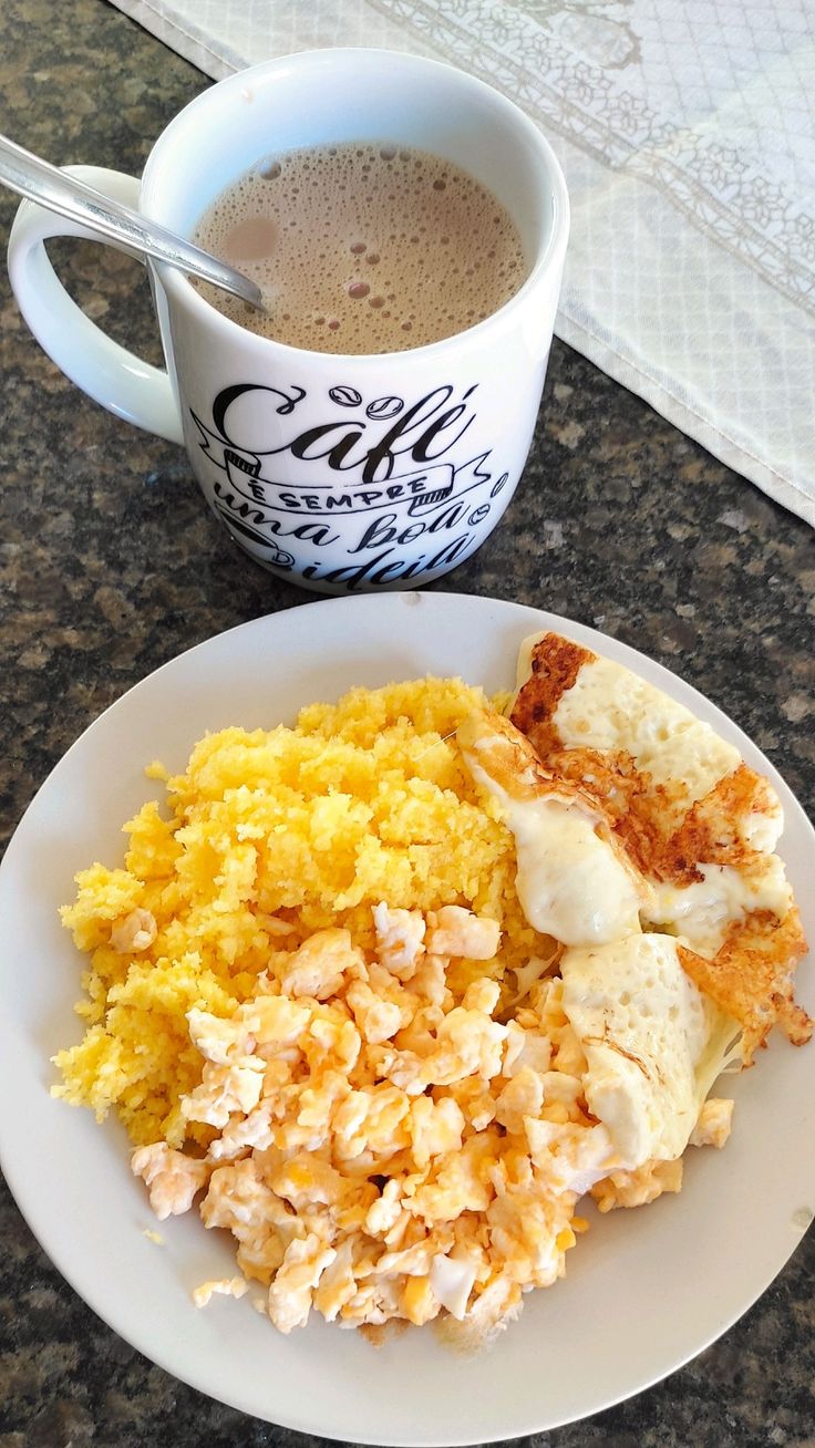 Café da manhã com tapioca crocante, ovos mexidos e cuscuz low carb, sabor incrível e preparo rápido em uma única frigideira